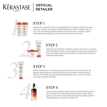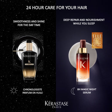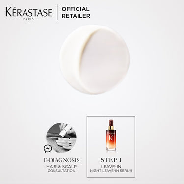 This overnight leave-in serum gives a nourishing boost to all dry hair types. During the night, hair is prone to reverse the daytime loss by absorbing all of nutrients of you hair care. Infused with Iris Root extract and a blend of 5 vitamins including vitamin E, the serum deeply penetrates the fiber over 8 hours for 100% absorption to restore hair's balanced nutrition levels. Its lightweight creamy texture suits all hair types: on fine hair it helps detangling and provides a better manageability on normal to coarse hair. Applied at night, hair progressively absorbs the nutrients of the nourishing serum to reverse daytime depletion. This milky-gel like cream melts into the hair to be quickly absorbed. The next morning, hair looks nourished and is visibly softer, easier to style, with a lightweight satin finish.