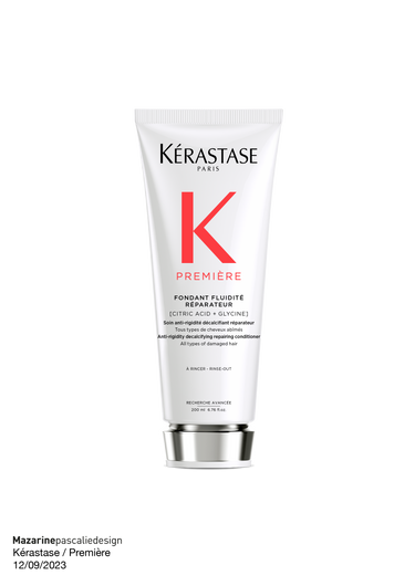 When hair is already damaged, calcium will accumulate, further weakening the cuticle and cortex of the hair. Kérastase Fondant Fluidité Réparateur dual-action fights calcium overdose, first decalcifying, then repairing hair. The rigid aspect of hair due to calcium in hard water is neutralized, further breakage is prevented, and hair is repaired from the inside out. Kérastase Première Fondant Fluidité Réparateur envelops hair with its lightweight jelly-like texture and restores hair strength and resilience. Your hair is left amazingly soft, smooth, and supple.
