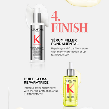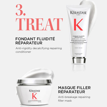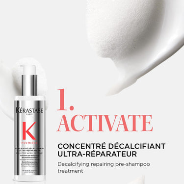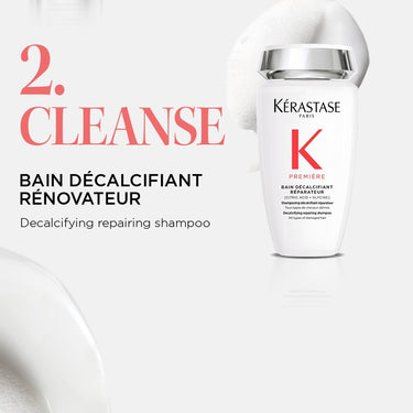 First, use the pre-shampoo treatment, Kérastase Première Concentré Décalcifiant Réparateur, and without rinsing, layer on Kérastase Bain Décalcifiant Réparateur for maximum decalcifying and repairing results. Why not try Intensive Resurfacing Repairing Serum for even more restructuring hair care?