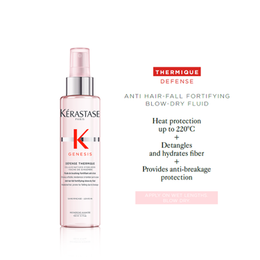 Anti hair-fall fortifying blow-dry fluid for weakened hair, prone to falling due to breakage. This milky formula provides anti-breakage protection and optimal hydration without frizz or weighing down the hair. Enriched with the combination of Edelweiss Native Cells and Ginger Root, Defense Thermique hydrates, reinforces and protects the hair from heat up to 220¡C to reduce the risk of hair-fall due to breakage;Hair is shiny and soft with a silky touch.