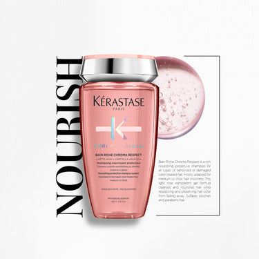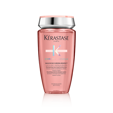 Bain Riche Chroma Respect is a rich nourishing protective shampoo for all types of sensitized or damaged color treated hair, mostly adapted for medium to thick fiber. Highly nourishing formula cares for hair while respecting and preserving hair color. Sulfates-free. Suitable for very sensitized hair with highlights.
